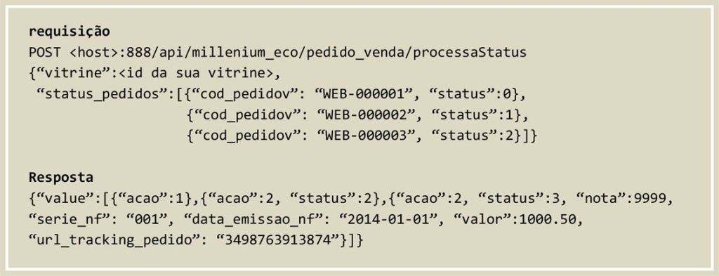 | 2 – Em separação | 3 – Despachado | O pedido foi faturado e a nota aprovada. Se foi implementada a integração SIGEP, o sistema irá aguardar que o numero do objeto seja informado. Os campos serão também retornados: nota, serie_nf, url_tracking_pedido, valor, data_emissao_nf |