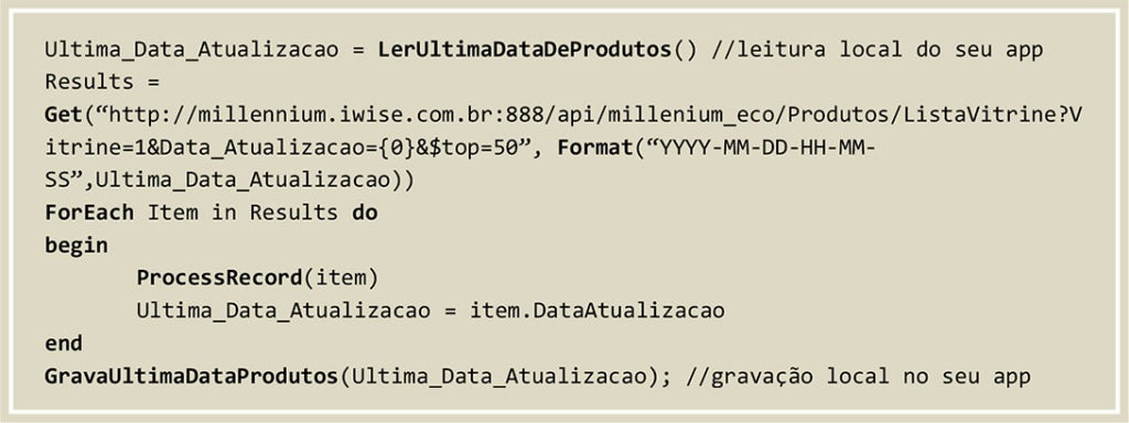 Abaixo temos um pseudo-código demonstrando este padrão para a listagem de produtos: