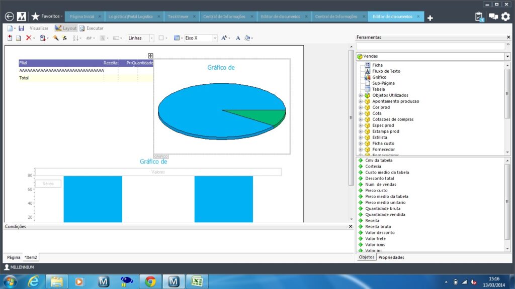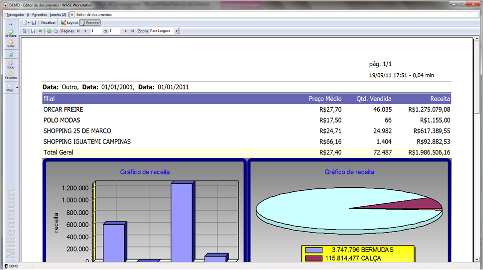 O Gerador de Relatórios do Linx | e-Millennium é uma ferramenta avançada, de fácil utilização e que foi projetada para aumentar a produtividade das informações do seu negócio. Com o Gerador de Relatórios você será capaz de fornecer informações, demonstrar os números do seu negócio, criar gráficos avançados, imprimir relatórios com alta qualidade e distribuí-los em diversos formatos (MS-Excel, PDF, etc.).